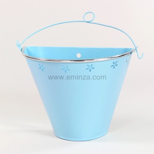 #Cache-pot en forme de seau laqué avec anse. Spécialement conçu pour s'accrocher au mur. Matière : zinc. Dimensions : 20 x 11 x 19 cm. Couleur : bleu.